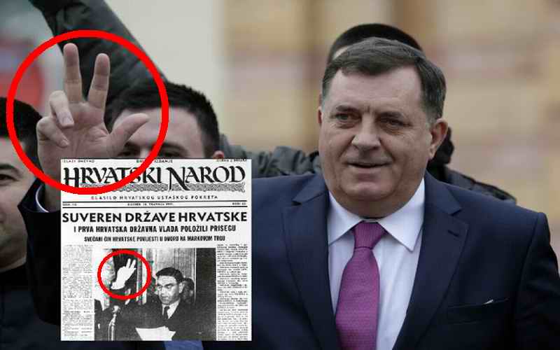 P.S. Dodik je zaista prevršio sa javnim prezentovanjem nacističkih simbola. Tradicionalni simbol pravoslavnih Srba su tri skupljena prsta. Podizanje tri raširena prsta simbol su Trećeg Rajha, kakav su ustaše preuzele kao oblik ispoljavanja nacističkog sljedbeništa (VIDI PODNASLOVNI FOTO). Do Vuka Draškovića i demonstracija 9. marta 1991. godine nijedan Srbin u cjelokupnoj istoriji nije podigao tri raširena prsta, posebice jer SPC brani takvo razjedinjavanja Oca, Sina i Duha svetog.